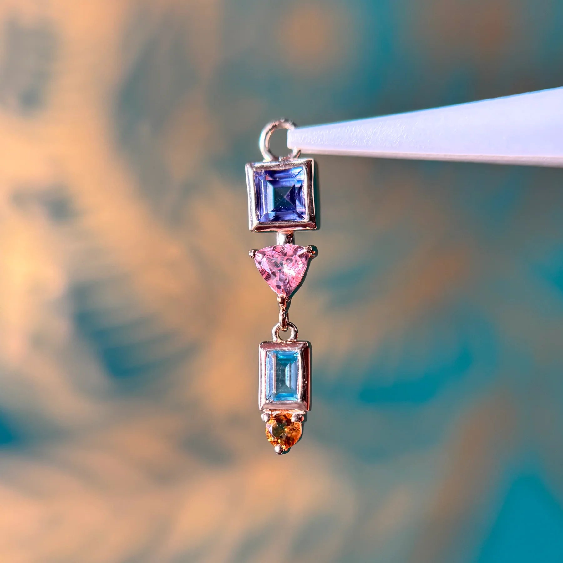 - 3mm Princess Cut Tanzanite, 3mm Trillion Cut Pink Sapphire, 2mm Baguette Cut Swiss Blue Topaz, 2mm Round Cut Citrine